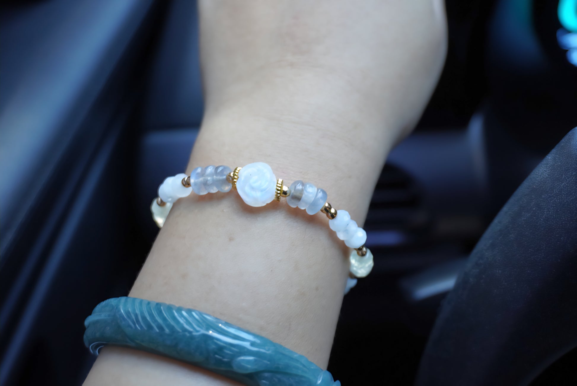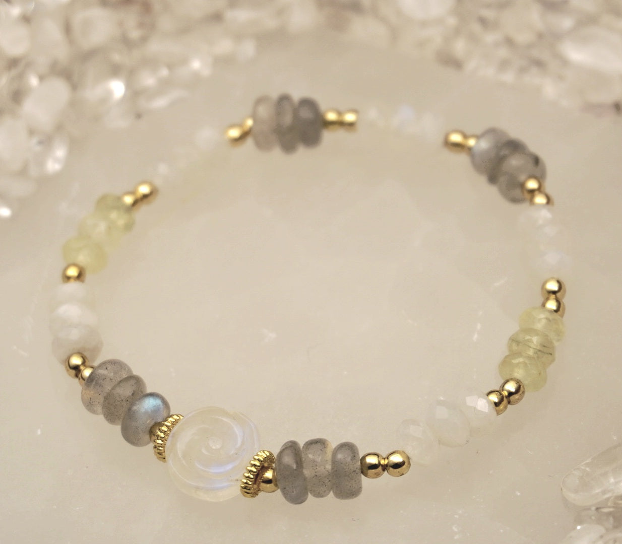 Prehnite: With its soft, mossy green hue, Prehnite acts as the "leaf and stem" of the bracelet. Known as the stone of the heart, it is believed to cultivate a sense of deep peace and a connection to the rhythms of nature.